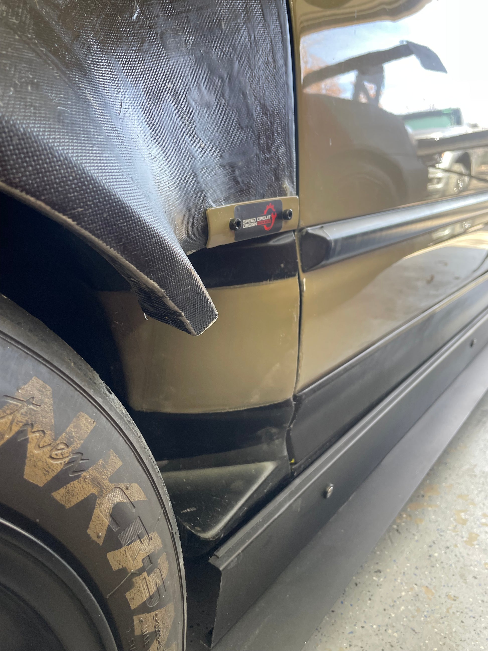 At this point, cut your fender very close top of the fender molding flat. Lay the fender on car and on top of the cutout flange. Trim your fender as necessary, use the supplied 3d printed flat flange to drill holes through the fender and cutout. Install the M5 rivnuts into the cutout top flange.